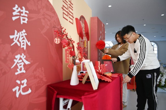 12月21日,工作人員在“墅外桃源”婚姻登記處整理婚慶用品。新華社記者 李然 攝