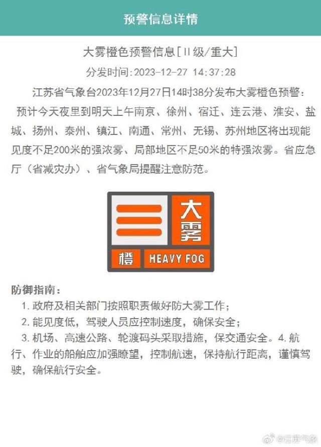 央視網(wǎng)消息:據(jù)@江蘇氣象 微博消息,江蘇省氣象臺2023年12月27日14時38分發(fā)布大霧橙色預(yù)警: 預(yù)計今天夜里到明天上午南京、徐州、宿遷、連云港、淮安、鹽城、揚(yáng)州、泰州、鎮(zhèn)江、南通、常州、無錫、蘇州地區(qū)將出現(xiàn)能見度不足200米的強(qiáng)濃霧、局部地區(qū)不足50米的特強(qiáng)濃霧。江蘇省應(yīng)急廳(省減災(zāi)辦)、省氣象局提醒注意防范。