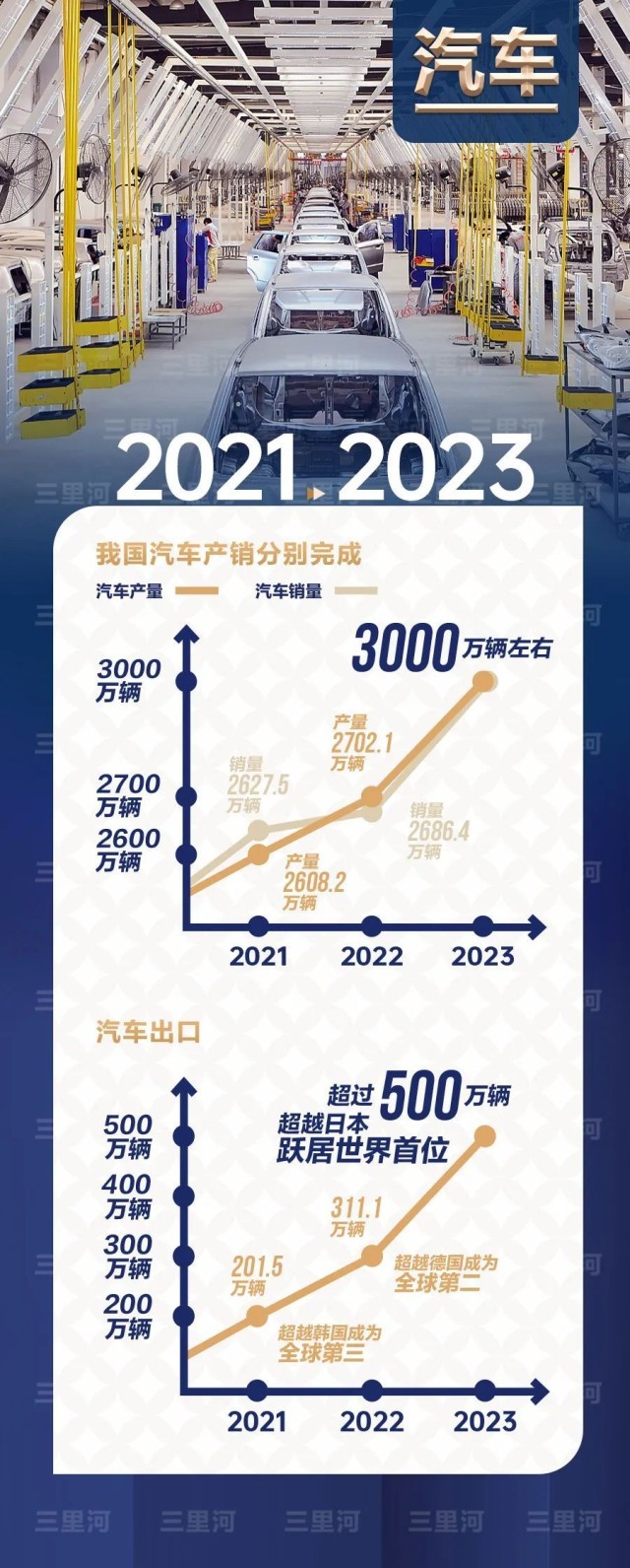 2023年,全年汽車產(chǎn)銷量預(yù)計(jì)達(dá)3000萬(wàn)輛左右、創(chuàng)歷史新高,出口超過500萬(wàn)輛,超越日本,躍居世界首位。