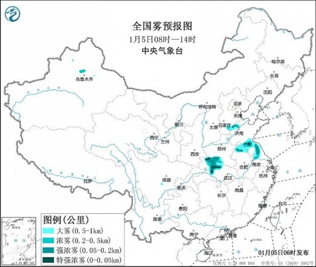 中央氣象臺1月5日06時繼續(xù)發(fā)布大霧黃色預(yù)警