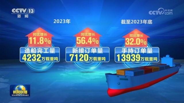 最新數(shù)據(jù)顯示,2023年我國造船完工量4232萬載重噸,同比增長11.8%;新承接訂單量7120萬載重噸,同比增長56.4%;截至2023年底,手持訂單量13939萬載重噸,同比增長32.0%,所有指標(biāo)第一次實現(xiàn)2位數(shù)增長。