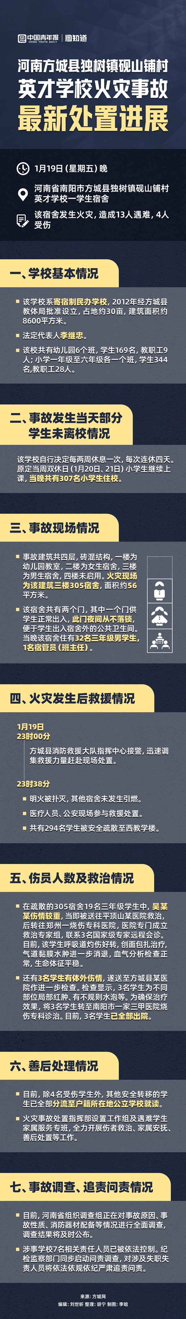 1月19日晚,河南省方城縣獨(dú)樹鎮(zhèn)硯山鋪村英才學(xué)校一宿舍發(fā)生火災(zāi),事故造成13人遇難,4人受傷。1月23日,方城縣通報(bào)了部分事故情況:當(dāng)晚有307名小學(xué)生住校,火災(zāi)現(xiàn)場為宿舍樓三樓305宿舍,面積56平方米;當(dāng)晚該宿舍住有32名三年級男學(xué)生,1名宿管員(班主任);涉事學(xué)校7名相關(guān)責(zé)任人員已被依法控制。