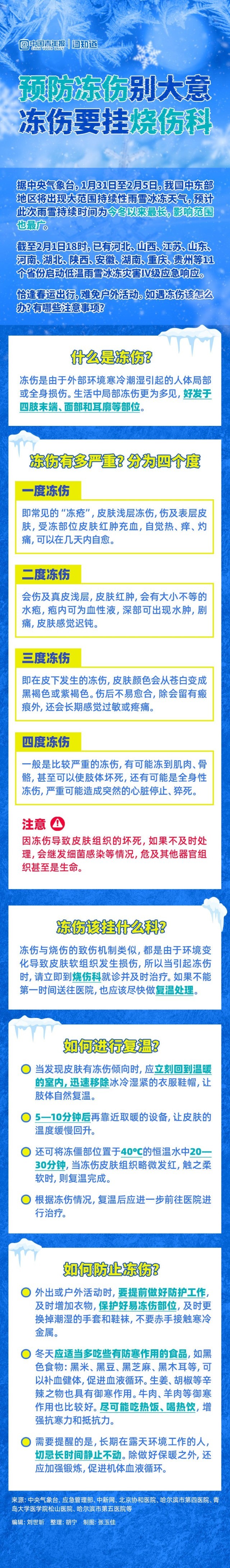 2月1日,中央氣象臺發(fā)布冰凍橙色預(yù)警。據(jù)預(yù)報,這是2009年以來冬季最強雨雪冰凍天氣,預(yù)計將持續(xù)6天,10省份將出現(xiàn)暴雪或大暴雪。恰逢春運出行,在旅途中也要謹防凍傷。如遇凍傷該怎么辦?如何緊急補救?想要就醫(yī)該掛什么科室?轉(zhuǎn)發(fā)收藏,祝福大家平安祥和迎春到,開心順利過大年。