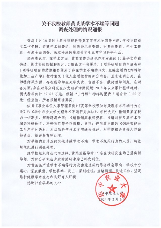 央視網(wǎng)消息:2月6日,華中農(nóng)業(yè)大學通報教師黃某某學術不端等問題調(diào)查處理情況。具體如下: