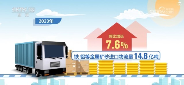 2023年,進(jìn)口物流總額18.0萬億元,同比增長13.0%,進(jìn)口物流量保持快速恢復(fù)態(tài)勢(shì)。原油、天然氣、煤炭等能源產(chǎn)品進(jìn)口物流量11.6億噸,同比增長27.2%,鐵、鋁等金屬礦砂進(jìn)口物流量14.6億噸,同比增長7.6%。