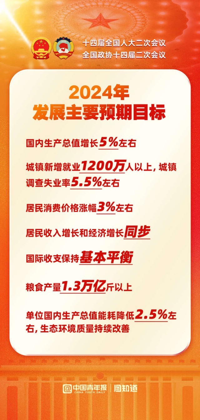 國內生產總值增長5%左右,城鎮(zhèn)新增就業(yè)1200萬人以上,糧食產量1.3萬億斤以上......2024年發(fā)展主要預期目標公布,向著這些目標共同奮斗!