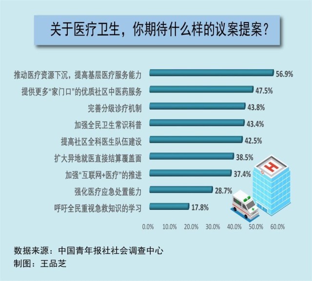 每年全國兩會(huì),醫(yī)療衛(wèi)生都是代表委員們熱議的話題。在全國兩會(huì)召開前夕,中國青年報(bào)社社會(huì)調(diào)查中心聯(lián)合問卷網(wǎng)(wenjuan.com),進(jìn)行了全國兩會(huì)青年期待調(diào)查,共有2002人參與。調(diào)查顯示,在兩會(huì)關(guān)于醫(yī)療衛(wèi)生領(lǐng)域的議題中,56.9%的受訪者最期待推動(dòng)醫(yī)療資源下沉,提高基層醫(yī)療服務(wù)能力,47.5%的受訪者期待提供更多“家門口”的優(yōu)質(zhì)社區(qū)中醫(yī)藥服務(wù)。