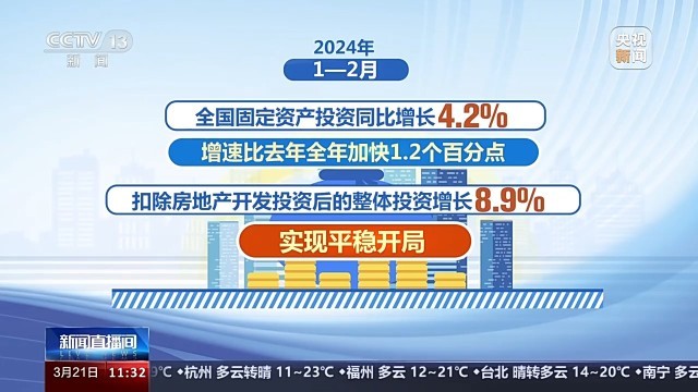 國家發(fā)展和改革委員會副主任劉蘇社介紹,今年以來,國家發(fā)展改革委會同有關(guān)方面,充分發(fā)揮政府投資的帶動放大效應(yīng),積極支持社會資本參與重大項目建設(shè),著力擴大有效益的投資。1—2月,全國固定資產(chǎn)投資同比增長4.2%,增速比去年全年加快1.2個百分點;扣除房地產(chǎn)開發(fā)投資后的整體投資增長8.9%,實現(xiàn)平穩(wěn)開局。