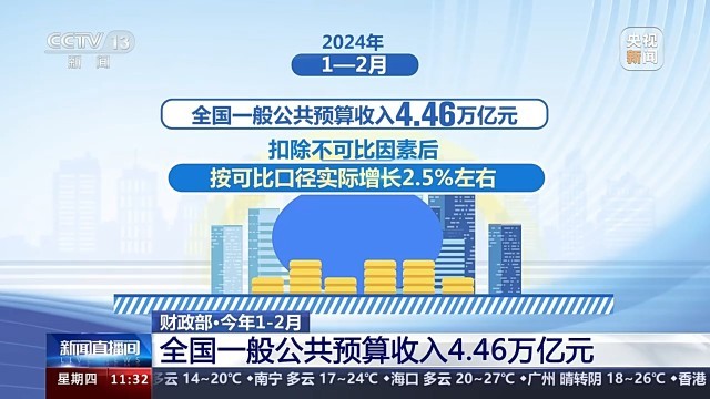 財政部副部長廖岷介紹,今年1—2月,全國一般公共預(yù)算收入4.46萬億元,扣除不可比因素后,按可比口徑實際增長2.5%左右,保持恢復(fù)性增長,與宏觀經(jīng)濟穩(wěn)中向好的態(tài)勢基本保持一致;全國一般公共預(yù)算支出同比增長6.7%,完成全年預(yù)算的15.3%,支出進度為近5年同期最快。