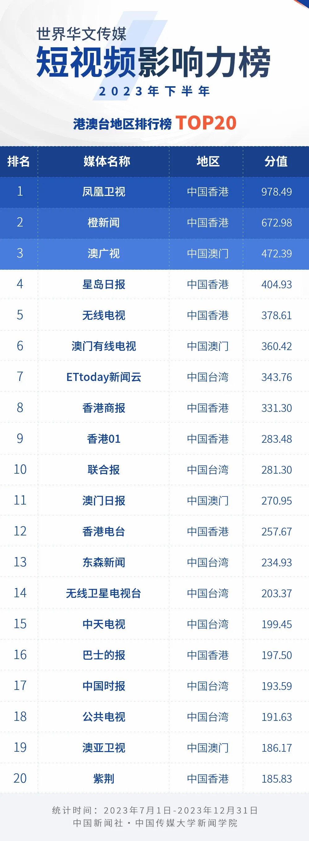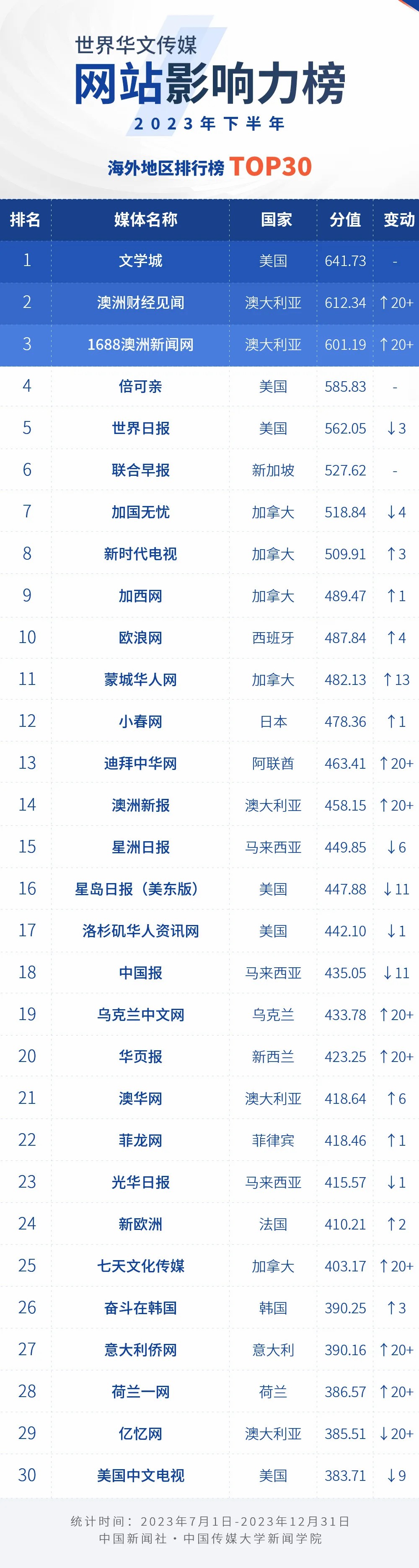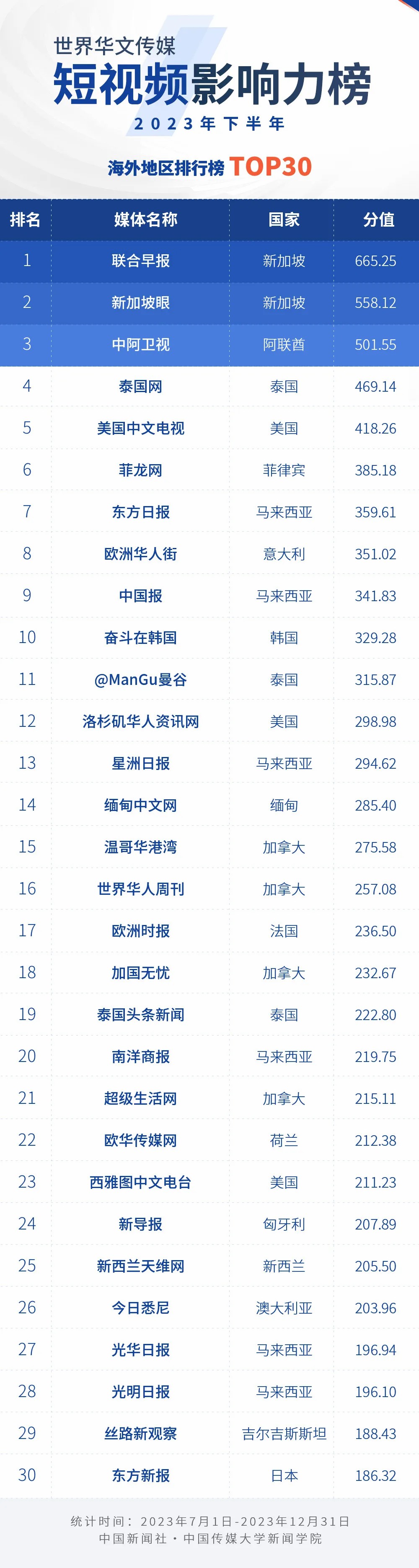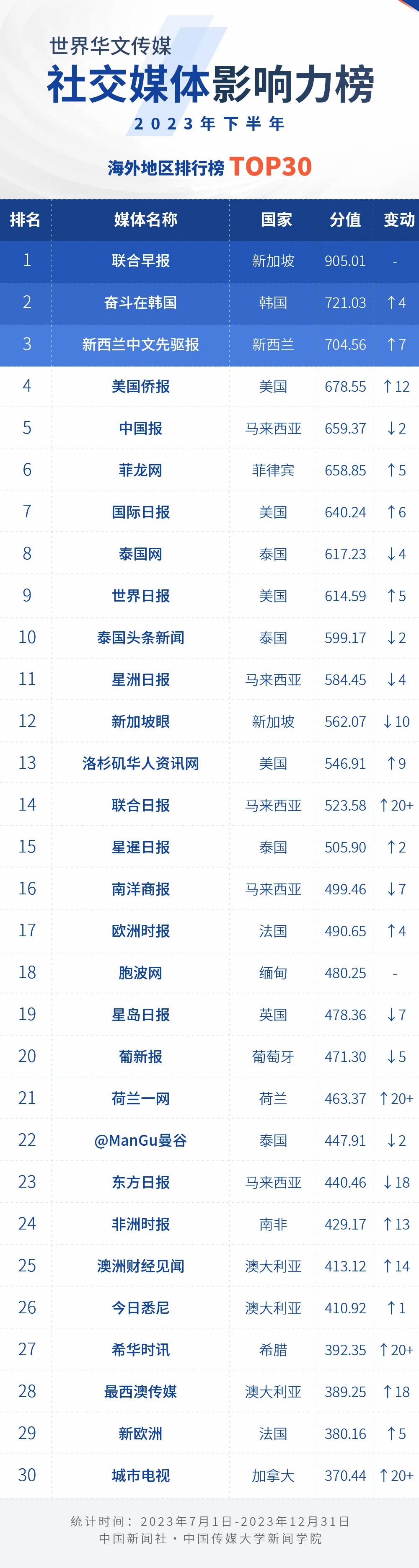 中國新聞社與中國傳媒大學新聞學院持續(xù)開展“世界華文傳媒新媒體影響力”測評項目,現(xiàn)根據(jù)2023年下半年世界華文傳媒新媒體的業(yè)務數(shù)據(jù),發(fā)布2023年下半年榜。
