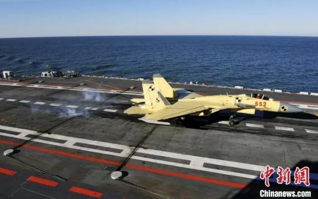 一名飛行員駕駛艦載機(jī)從航母上起飛