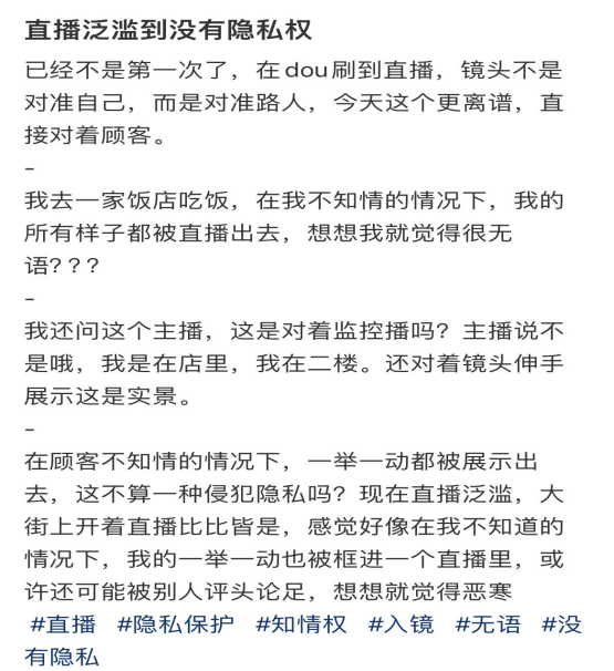 據(jù)媒體報(bào)道,近期,陜西西安兩名老人用餐時(shí)被商家拍下視頻,之后商家又私自將拍攝內(nèi)容發(fā)到網(wǎng)上,老人親戚無意刷到視頻才發(fā)現(xiàn)。在老人家屬與其多次溝通后,商家刪除了視頻。消費(fèi)者多在不知情或者未被征詢意見的情況下被動(dòng)充當(dāng)商家直播或者拍攝短視頻的引流工具,除了自己的言行舉止可能被迫接受他人的凝視和審判外,還有面部信息泄露風(fēng)險(xiǎn)。