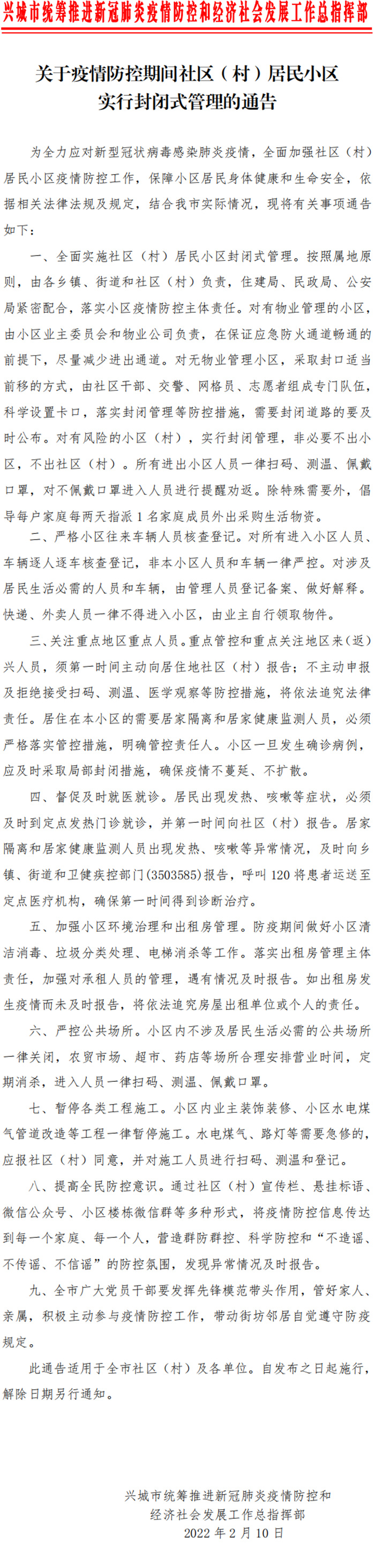 中新網(wǎng)2月11日電 據(jù)興城市政府網(wǎng)站消息,遼寧葫蘆島興城市統(tǒng)籌推進新冠肺炎疫情防控和經(jīng)濟社會發(fā)展工作總指揮部10日發(fā)布通知,即日起,全面實施社區(qū)(村)居民小區(qū)封閉式管理,對有風險的小區(qū)(村),實行封閉管理,非必要不出小區(qū),不出社區(qū)(村)。