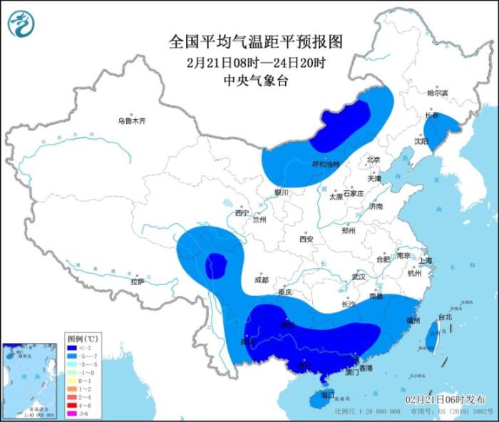 受持續(xù)陰雨雪和冷空氣共同影響,我國(guó)南方大部地區(qū)氣溫將顯著偏低。預(yù)計(jì)21日08時(shí)至24日20時(shí),貴州、四川西部和南部、湖南南部、江西中南部、云南東部、廣西、廣東、福建、海南和臺(tái)灣島等地的日平均氣溫較歷史同期偏低5℃以上,其中,云南東部、貴州南部、湖南南部、江西南部、廣西大部、廣東中西部等地偏低7℃以上,最低氣溫0℃線將壓至貴州南部、湖南南部、江西北部到浙江南部一帶,4℃線將壓至廣西中部到廣東中部一帶。另外,內(nèi)蒙古中部、吉林、青藏高原東部等地日平均氣溫也較歷史同期偏低5℃,部分地區(qū)偏低7℃。(見(jiàn)圖1、圖2)。