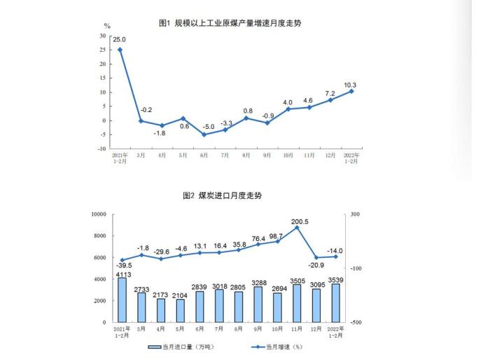 原煤生產(chǎn)較快增長(zhǎng),進(jìn)口降幅收窄。1—2月份,生產(chǎn)原煤6.9億噸,同比增長(zhǎng)10.3%,增速比上年12月份加快3.1個(gè)百分點(diǎn),日均產(chǎn)量1164萬(wàn)噸。進(jìn)口煤炭3539萬(wàn)噸,同比下降14.0%,降幅比上年12月份收窄6.9個(gè)百分點(diǎn)。
