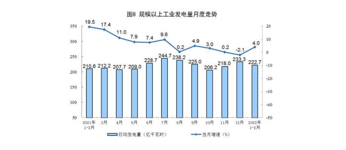 電力生產(chǎn)由降轉(zhuǎn)升。1—2月份,發(fā)電量13141億千瓦時(shí),同比增長(zhǎng)4.0%,上年12月份為下降2.1%,日均發(fā)電222.7億千瓦時(shí)。