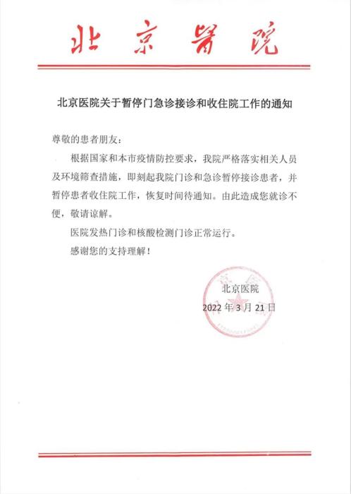 中新網(wǎng)3月21日電 據(jù)北京醫(yī)院微信公眾號(hào)21日消息,根據(jù)國(guó)家和北京市疫情防控要求,該醫(yī)院嚴(yán)格落實(shí)相關(guān)人員及環(huán)境篩查措施,即刻起該醫(yī)院門(mén)診和急診暫停接診患者,并暫?;颊呤兆≡汗ぷ鳎謴?fù)時(shí)間另行通知。發(fā)熱門(mén)診和核酸檢測(cè)門(mén)診正常運(yùn)行。通知如下: