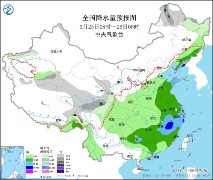 3月24日08時(shí)至25日08時(shí),內(nèi)蒙古東部、黑龍江北部和東部、新疆西北部和南部、西藏東北部、青海北部和東南部、甘肅河西和西南部等地的部分地區(qū)有小到中雪或雨夾雪,其中,內(nèi)蒙古東北部、黑龍江西部、新疆北疆北部和南疆盆地等地的部分地區(qū)有大雪(5~9毫米)。江淮大部、江漢東部、江南大部、華南中東部等地的部分地區(qū)有中到大雨,其中,安徽西南部、湖北東部、江西北部等地的部分地區(qū)暴雨(50~80毫米)。內(nèi)蒙古中西部、遼東半島、新疆南部、西藏北部、甘肅河西、寧夏中北部、山東半島等地的部分地區(qū)有4~6級風(fēng),其中,新疆東部、青海西北部等地的部分地區(qū)有6~7級風(fēng)(見圖2)。