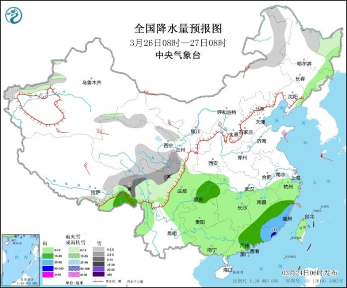 3月25日08時(shí)至26日08時(shí),內(nèi)蒙古東北部、黑龍江北部、新疆南疆盆地、西藏北部、青海中南部、甘肅西南部、川西高原北部等地的部分地區(qū)有小到中雪或雨夾雪,其中,內(nèi)蒙古東北部、黑龍江西北部、西藏東部等地的部分地區(qū)有大雪(5~9毫米)。吉林東南部、遼寧東部、山東中東部、江淮、江南大部、貴州東南部、華南北部等地的部分地區(qū)有中到大雨,其中,遼寧東部、江西北部、浙江西南部、福建西北部等地的部分地區(qū)暴雨(50~80毫米)。內(nèi)蒙古中西部、遼東半島、西藏北部、青海南部、陜西北部、山東半島、浙江北部等地的部分地區(qū)有4~6級風(fēng)(見圖3)。