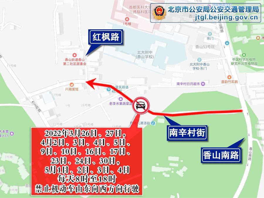 特別提示去往香山地區(qū)的市民朋友:4月2日、3日、4日、5日、9日、10日、16日、17日、23日、24日,5月1日、2日、3日、4日,每天8時至18時,南辛村街(紅楓路至香山南路段)禁止機(jī)動車由東向西方向行駛。