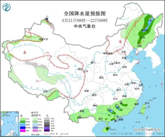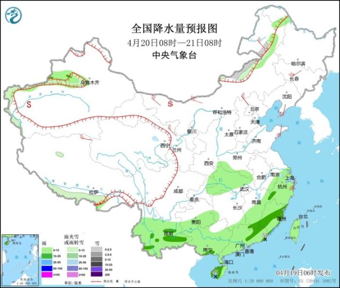4月19日08時(shí)至20日08時(shí),新疆北疆北部、青海東部、甘肅西南部、川西高原北部等地的部分地區(qū)有小到中雪或雨夾雪;四川南部、貴州中西部、云南東部和南部、福建南部、廣東、臺灣島等地的部分地區(qū)有中到大雨,其中云南南部等地局地暴雨(50~55毫米)。新疆北部和沿天山地區(qū)、內(nèi)蒙古、東北地區(qū)、山東半島、西藏中東部、青海南部和東部等地的部分地區(qū)有4~6級風(fēng),其中新疆北部、西藏中部部分地區(qū)有6~7級風(fēng)(見圖1);渤海有5~6級、陣風(fēng)7級的西南風(fēng),臺灣海峽、南海北部海域有5~6級、陣風(fēng)7級的偏東到東北風(fēng)。