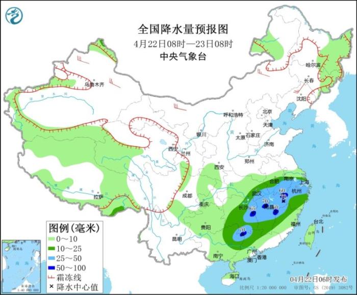 4月22日08時至23日08時,新疆北疆北部、青海南部、西藏北部等地部分地區(qū)有小到中雪或雨夾雪,局地有大到暴雪。江淮南部、江漢東部、江南大部、華南北部等地部分地區(qū)有中到大雨,其中,安徽南部、湖南東部、江西中北部、浙江西部、廣西東北部等地局地有暴雨(50~70毫米)。新疆北部、內(nèi)蒙古、東北南部等地部分地區(qū)有4~6級風(fēng)(見圖1)。