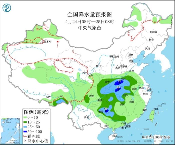 4月24日08時至25日08時,新疆北疆北部、青海南部、西藏北部等地部分地區(qū)有小到中雪或雨夾雪。西藏東南部、西北地區(qū)東南部、西南地區(qū)東部、黃淮西部、江淮西部、江漢、江南北部、華南北部等地部分地區(qū)有中到大雨,其中,河南西南部、湖北北部、貴州東南部等地部分地區(qū)有暴雨(50~90毫米)。內(nèi)蒙古西北部、新疆北疆北部等地部分地區(qū)有4~6級風(fēng),其中,新疆東部部分地區(qū)有6~8級風(fēng)(見圖3)。