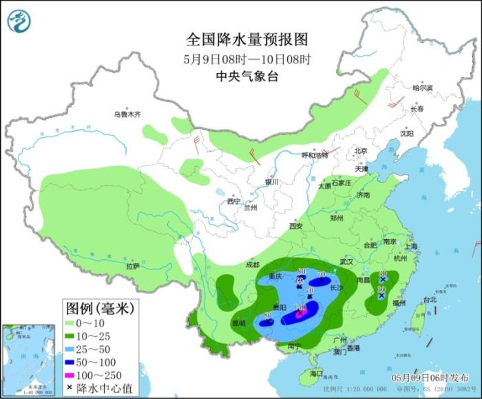 5月9日08時至10日08時,西南地區(qū)東部和南部、江南西部、華南北部和西部等地部分地區(qū)有中到大雨,其中,湖南中西部、重慶東南部、貴州東南部、廣西北部等地部分地區(qū)有暴雨或大暴雨(100~140毫米)。甘肅河西、內(nèi)蒙古大部、東北地區(qū)等地部分地區(qū)有4~6級風(fēng)。