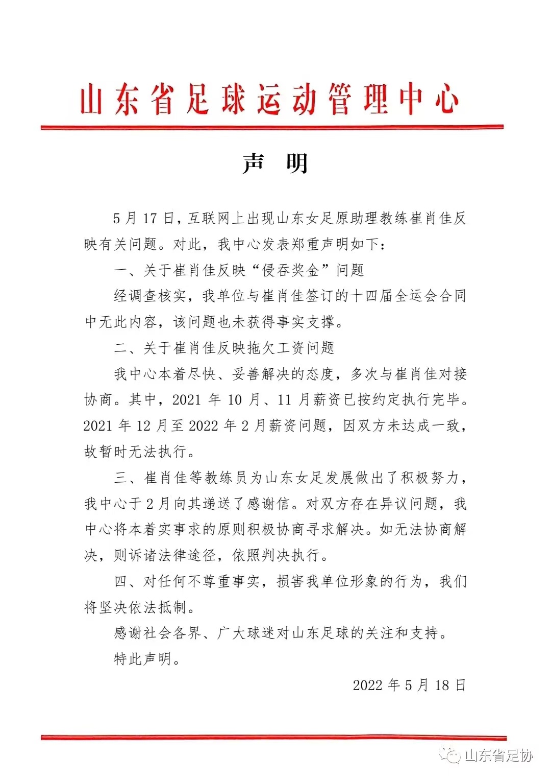 三、崔肖佳等教練員為山東女足發(fā)展做出了積極努力,我中心于2月向其遞送了感謝信。對雙方存在異議問題,我中心將本著實(shí)事求是的原則積極協(xié)商尋求解決。如無法協(xié)商解決,則訴諸法律途徑,依照判決執(zhí)行。