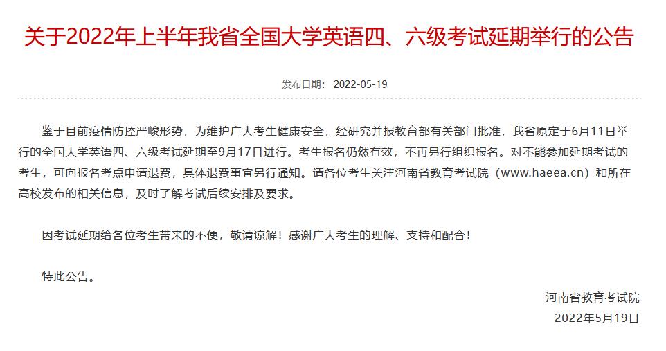 河南省全國(guó)大學(xué)英語四、六級(jí)考試延期至9月17日