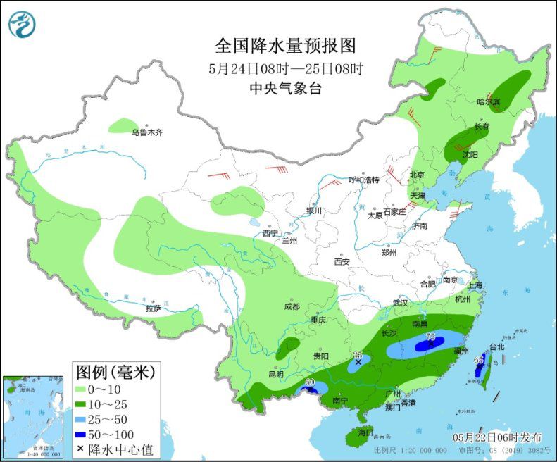 5月24日08時(shí)至25日08時(shí),西藏北部和西部、青海南部、川西高原等地有小雨或陣雨,高海拔地區(qū)有小到中雪或雨夾雪;江南中南部、華南大部、云南南部、黑龍江東部、遼寧中部、臺(tái)灣島等地部分地區(qū)有中到大雨,其中,江西南部、福建西部、云南東南部、廣西西南部、臺(tái)灣島西部等地部分地區(qū)有暴雨(50~75毫米)。東北地區(qū)中南部、華北北部和東部、黃淮北部和東部、內(nèi)蒙古、甘肅北部等地部分地區(qū)有4~6級(jí)風(fēng),內(nèi)蒙古西部部分地區(qū)有6~7級(jí)風(fēng)。