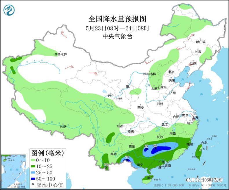 5月23日08時(shí)至24日08時(shí),西藏、青海南部、川西高原等地有小雨或陣雨,高海拔地區(qū)有小到中雪或雨夾雪;華南大部、江南南部、云南南部、臺(tái)灣島等地部分地區(qū)有中到大雨,其中,湖南南部、江西南部、廣西西南部和東北部、廣東西北部等地部分地區(qū)有暴雨(50~85毫米)。江南東部、內(nèi)蒙古中東部、東北地區(qū)中南部、甘肅北部、新疆北疆和南疆東部等地部分地區(qū)有4~6級(jí)風(fēng)。
