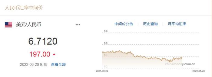 人民幣對美元中間價(jià)下調(diào)197個(gè)基點(diǎn) 1美元對人民幣6.7120元