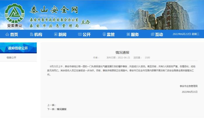 中新網(wǎng)6月22日電 據(jù)山東省泰安市應(yīng)急管理局網(wǎng)站消息,山東泰安市應(yīng)急管理局21日發(fā)布通報(bào),6月21日上午,泰安市綠地公館一層的一門(mén)頭房因液化氣罐泄漏引發(fā)的爆炸事故,共造成13人受傷。截至目前,共有3人因受傷嚴(yán)重、傷情惡化,經(jīng)搶救無(wú)效死亡。其余受傷人員正在接受進(jìn)一步治療。