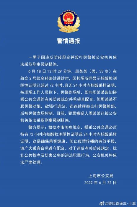 6月18日13時(shí)29分許,周某某(男,33歲)在軌交2號(hào)線金科路站進(jìn)站時(shí),因其場(chǎng)所碼顯示核酸檢測(cè)陰性證明已超過72小時(shí),且無(wú)24小時(shí)內(nèi)核酸采樣證明,被現(xiàn)場(chǎng)工作人員攔下。民警到場(chǎng)后,即向周某某告知搭乘公共交通的有關(guān)防疫規(guī)定并希望其配合。但周某某不顧民警勸阻,欲強(qiáng)行進(jìn)站,還連續(xù)揮拳擊打民警臉部,后被民警當(dāng)場(chǎng)控制。目前,犯罪嫌疑人周某某已被公安機(jī)關(guān)依法采取刑事強(qiáng)制措施。