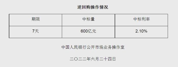 - 央行6月24日開展600億元逆回購(gòu)操作 中標(biāo)利率2.10%