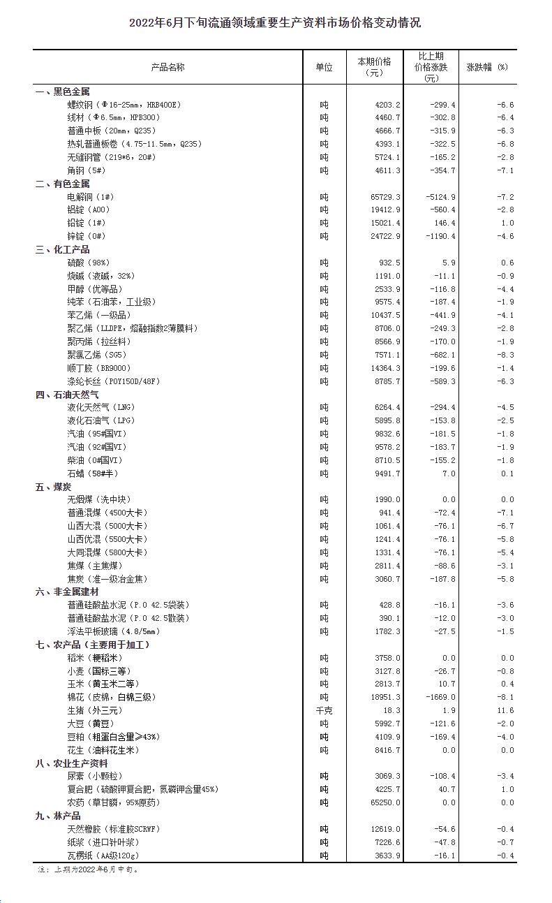 中新網(wǎng)7月4日電 國家統(tǒng)計(jì)局網(wǎng)站4日公布2022年6月下旬流通領(lǐng)域重要生產(chǎn)資料市場(chǎng)價(jià)格變動(dòng)情況。據(jù)對(duì)全國流通領(lǐng)域9大類50種重要生產(chǎn)資料市場(chǎng)價(jià)格的監(jiān)測(cè)顯示,2022年6月下旬與6月中旬相比,6種產(chǎn)品價(jià)格上漲,40種下降,4種持平。其中,生豬(外三元)價(jià)格報(bào)18.3元/千克,環(huán)比上漲11.6%。(中新財(cái)經(jīng))