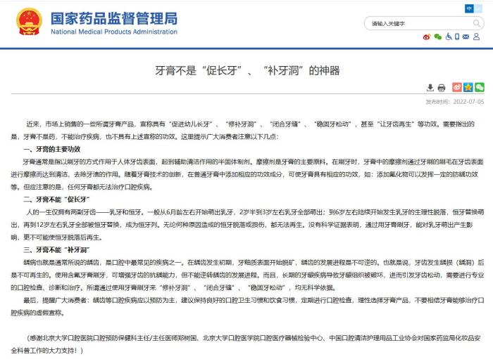 國家藥監(jiān)局:牙膏不是“促長牙”、“補(bǔ)牙洞”的神器