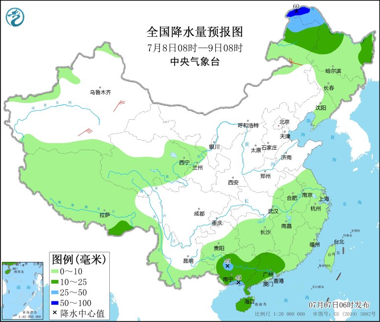7月8日08時至9日08時,內(nèi)蒙古東北部、黑龍江西部和東部、華南大部等地部分地區(qū)有中到大雨,其中,內(nèi)蒙古東北部、黑龍江西北部等地部分地區(qū)有暴雨(50~60毫米)。新疆沿天山地區(qū)和南疆盆地等地部分地區(qū)有4~6級風。南海西南部海域?qū)⒂?~6級、陣風7級的偏西風。