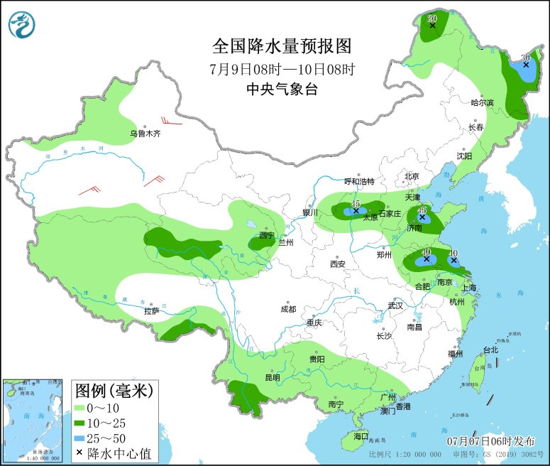 7月9日08時至10日08時,內(nèi)蒙古東北部、東北地區(qū)東部、西北地區(qū)中部、華北中西部和南部、黃淮大部、江淮大部、華南大部、臺灣島等地有小到中雨,其中,黑龍江東北部、山西中部、山東中部、蘇皖北部等地部分地區(qū)有大雨(25~45毫米)。新疆沿天山地區(qū)和南疆盆地等地部分地區(qū)有4~6級風。南海南部海域?qū)⒂?~6級、陣風7級的偏西到西南風。
