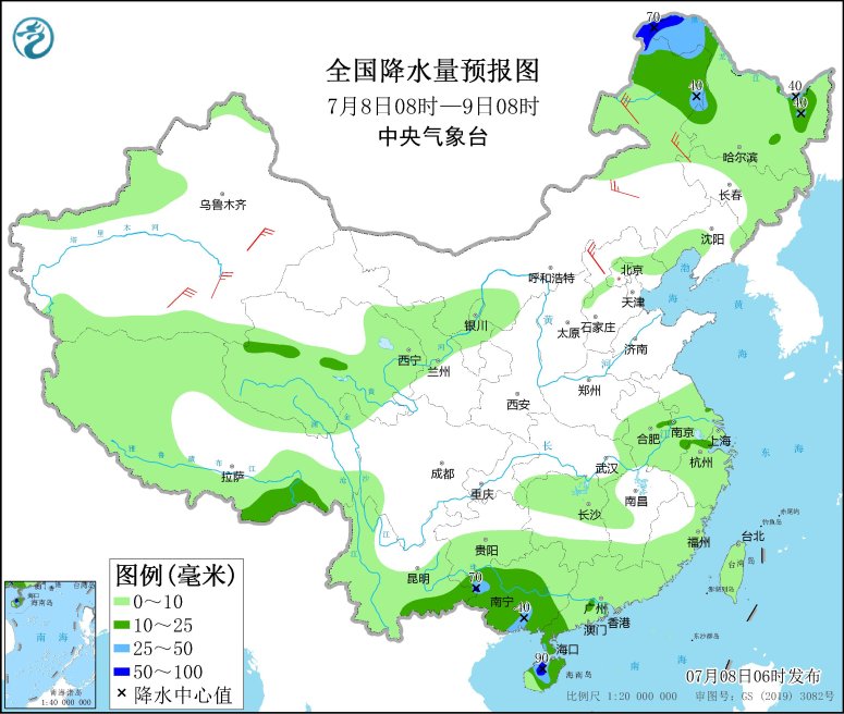 7月8日08時至9日08時,內蒙古東北部、黑龍江西部和東北部、云南南部、華南西部和南部等地部分地區(qū)有中到大雨,其中,內蒙古東北部等地局地有暴雨(50~90毫米)。內蒙古中東部、新疆沿天山地區(qū)和南疆盆地等地部分地區(qū)有4~6級風;南海南部海域有5~7級、陣風8級的偏西風。