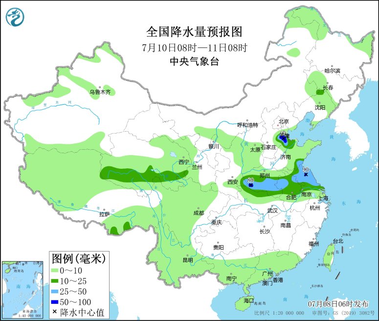 7月10日08時至11日08時,青海南部、河北南部、黃淮西部、江淮大部等地部分地區(qū)有中到大雨,其中,河北中南部、河南西部、江蘇北部等地局地有暴雨(50~90毫米);南海南部海域有5~7級、陣風8級的偏西風。