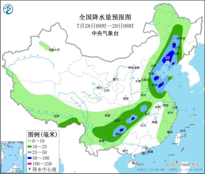 7月28日08時至29日08時,內(nèi)蒙古東南部、東北地區(qū)西部和南部、華北東部、黃淮東部、江漢大部、湖南北部和西部、西南地區(qū)東南部等地部分地區(qū)有中到大雨,其中,遼寧中西部、山東中部、湖南北部、貴州中部等地部分地區(qū)有暴雨,局地大暴雨(100~110毫米)(見圖3)。
