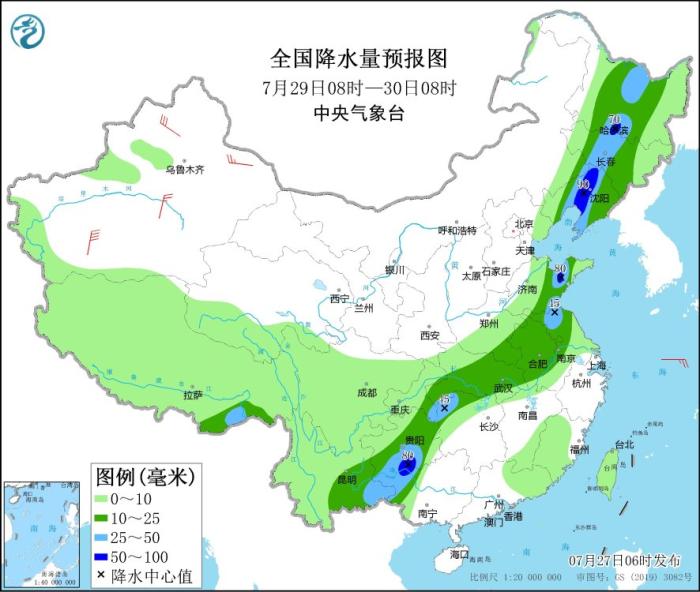 圖4 全國降水量預(yù)報圖(7月29日08時-30日08時)