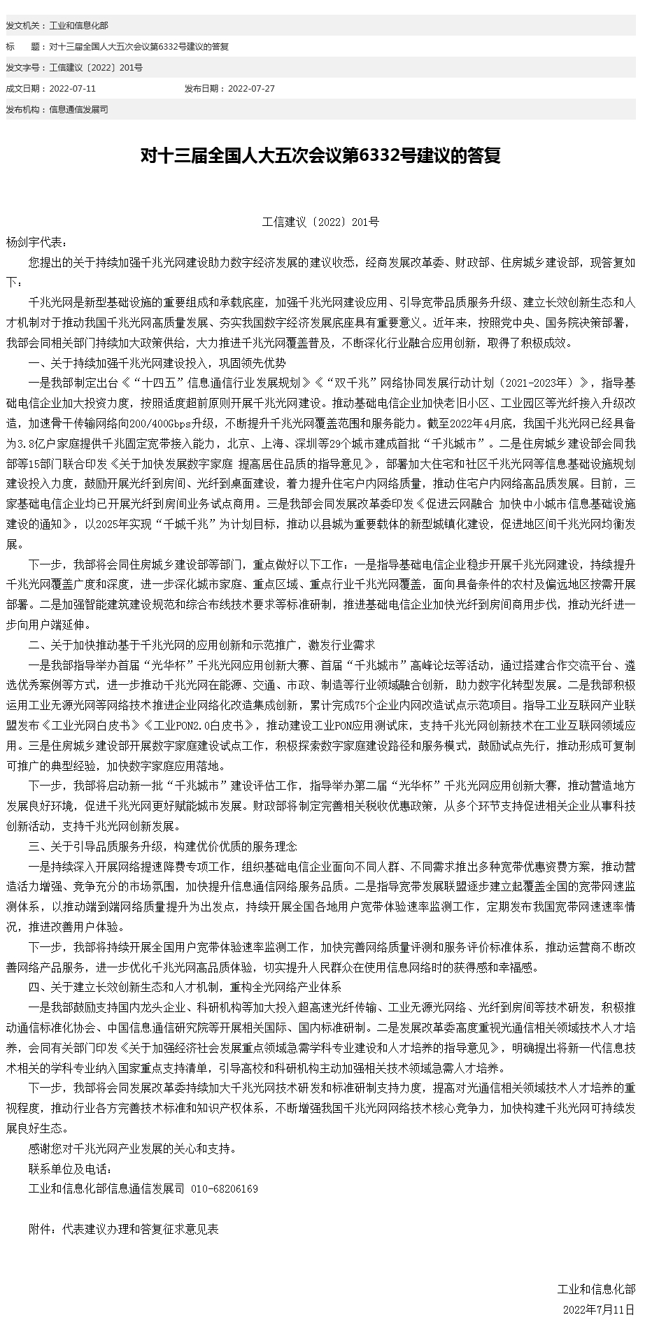 中新網(wǎng)7月27日電 工信部網(wǎng)站27日發(fā)布對十三屆全國人大五次會(huì)議第6332號(hào)建議的答復(fù)。工信部表示,將指導(dǎo)基礎(chǔ)電信企業(yè)穩(wěn)步開展千兆光網(wǎng)建設(shè),持續(xù)提升千兆光網(wǎng)覆蓋廣度和深度,進(jìn)一步深化城市家庭、重點(diǎn)區(qū)域、重點(diǎn)行業(yè)千兆光網(wǎng)覆蓋,面向具備條件的農(nóng)村及偏遠(yuǎn)地區(qū)按需開展部署。加強(qiáng)智能建筑建設(shè)規(guī)范和綜合布線技術(shù)要求等標(biāo)準(zhǔn)研制,推進(jìn)基礎(chǔ)電信企業(yè)加快光纖到房間商用步伐,推動(dòng)光纖進(jìn)一步向用戶端延伸。(中新財(cái)經(jīng))