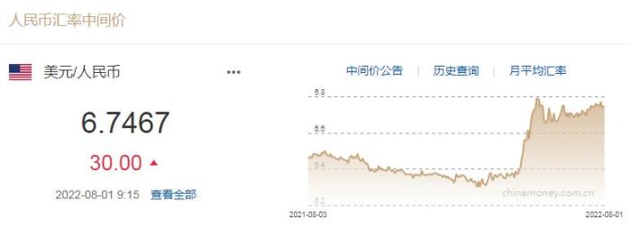 8月1日人民幣對美元中間價報6.7467元 下調30個基點