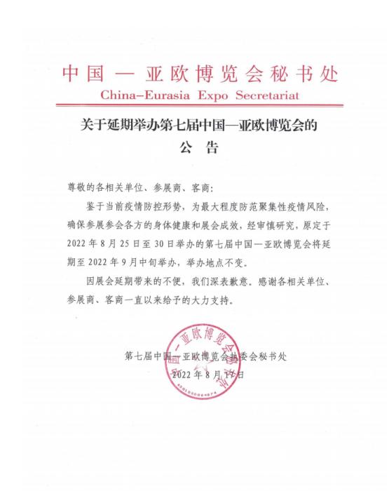 8月17日晚,第七屆中國—亞歐博覽會官網(wǎng)發(fā)布公告,宣布原定于8月25日在烏魯木齊舉辦的第七屆中國—亞歐博覽會將延期至9月中旬舉辦。通知內(nèi)容如下: