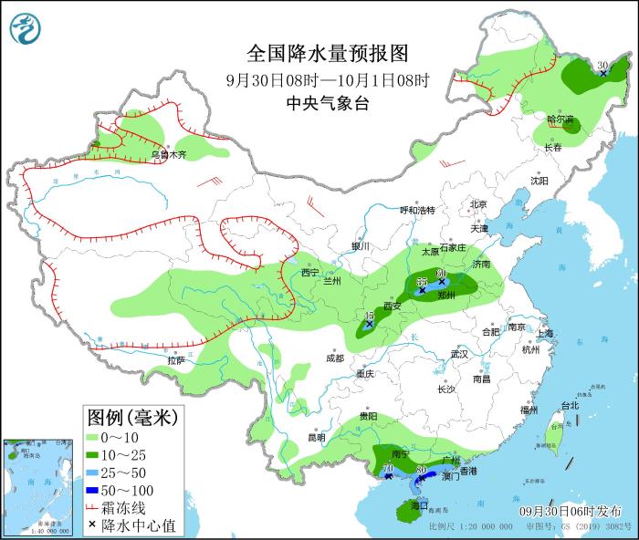 9月30日08時(shí)至10月1日08時(shí),廣西南部、廣東西南部、海南島、四川東北部、陜西南部、山西南部、河南北部等地的部分地區(qū)有中到大雨,局地暴雨(50~70毫米);黑龍江、吉林北部、新疆沿天山地區(qū)、青藏高原中東部等地的部分地區(qū)有小到中雨。新疆東部、內(nèi)蒙古中西部、東北地區(qū)東部等地的部分地區(qū)有4~6級(jí)風(fēng),新疆東部部分地區(qū)有7~8級(jí)風(fēng)。