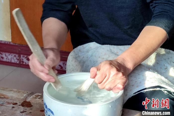 在水中反復(fù)梳洗毛筆頭是制筆的重要環(huán)節(jié)?!枪跇?biāo) 攝