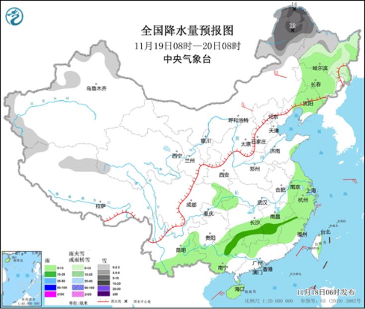 11月18日08時(shí)至19日08時(shí),內(nèi)蒙古中東部、黑龍江西部、河北北部等地部分地區(qū)有小到中雪或雨夾雪,其中,內(nèi)蒙古東北部部分地區(qū)有中到大雪(5~8毫米)。華北西部、黃淮、江淮、江漢、江南、西南地區(qū)東部、華南西部等地部分地區(qū)有小到中雨,其中,廣西西北部、湖南東部、江西中部、浙江南部等地部分地區(qū)有大雨。內(nèi)蒙古中部部分地區(qū)有5~6級(jí)風(fēng)(見(jiàn)圖2)。東海北部海域?qū)⒂?~7級(jí)、陣風(fēng)8級(jí)的偏東風(fēng)。
